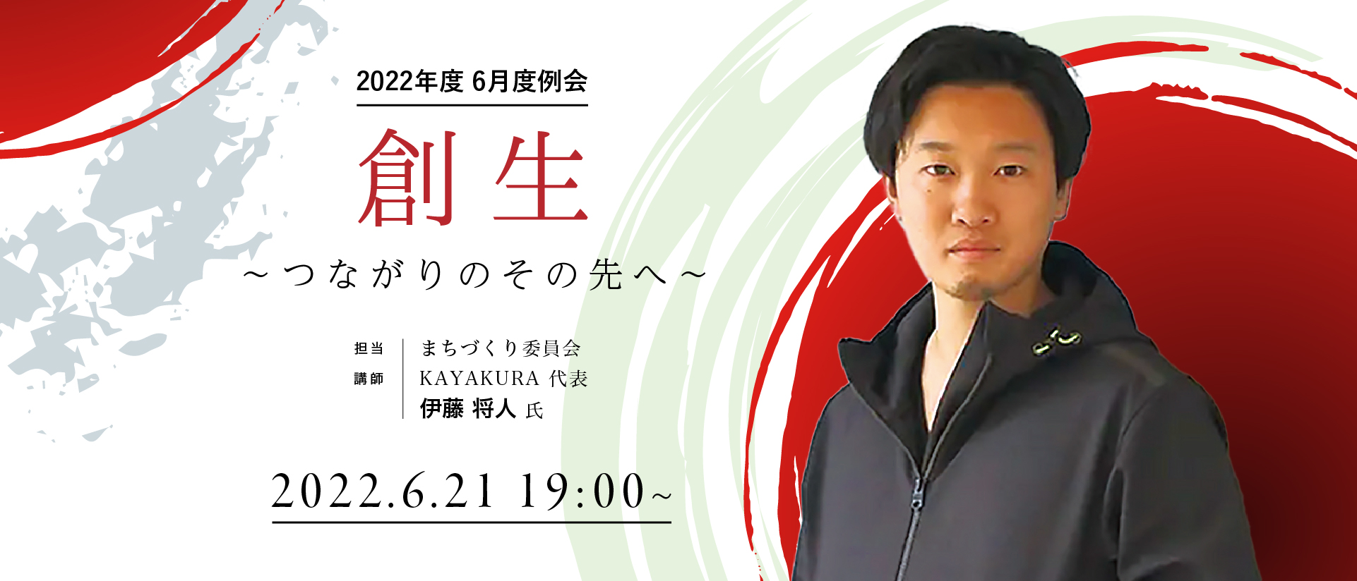 この度、一般社団法人西宮青年会議所では、6月度例会「創生~つながりのその先へ~」と題しまして、まちづくり・移住促進・観光インバウンドなどを促進する事業を多数手がけておられますKAYAKURA代表の伊藤将人氏を講師としてお招きし、例会を開催致します。本例会では、人とのつながりの重要性について考え、まちづくり事業の成功例からまちや社会に対し採るべき行動アイディアを学ぶことにより、私たち市民の生活やまちの発展のための有益なお話をお届けする内容となっております。