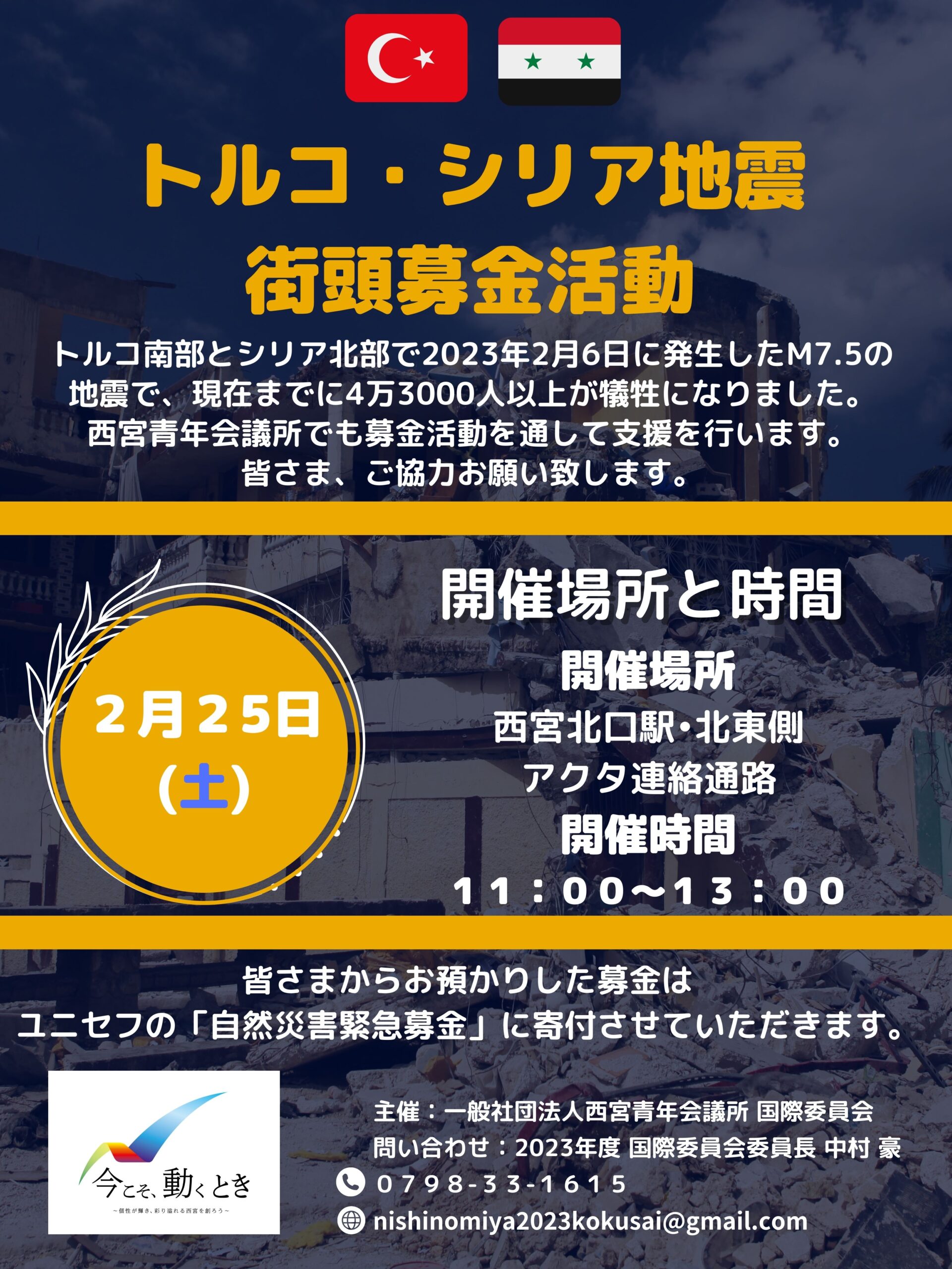 西宮青年会議所では復興支援として、2月25日(土)11:00〜13:00に西宮北口駅・北東側アクタ連絡通路2Fにて街頭募金を行います。いただいた寄付金は、ユニセフの「自然災害緊急募金」に寄付させていただきます。皆様の温かいご支援をお待ちしております。