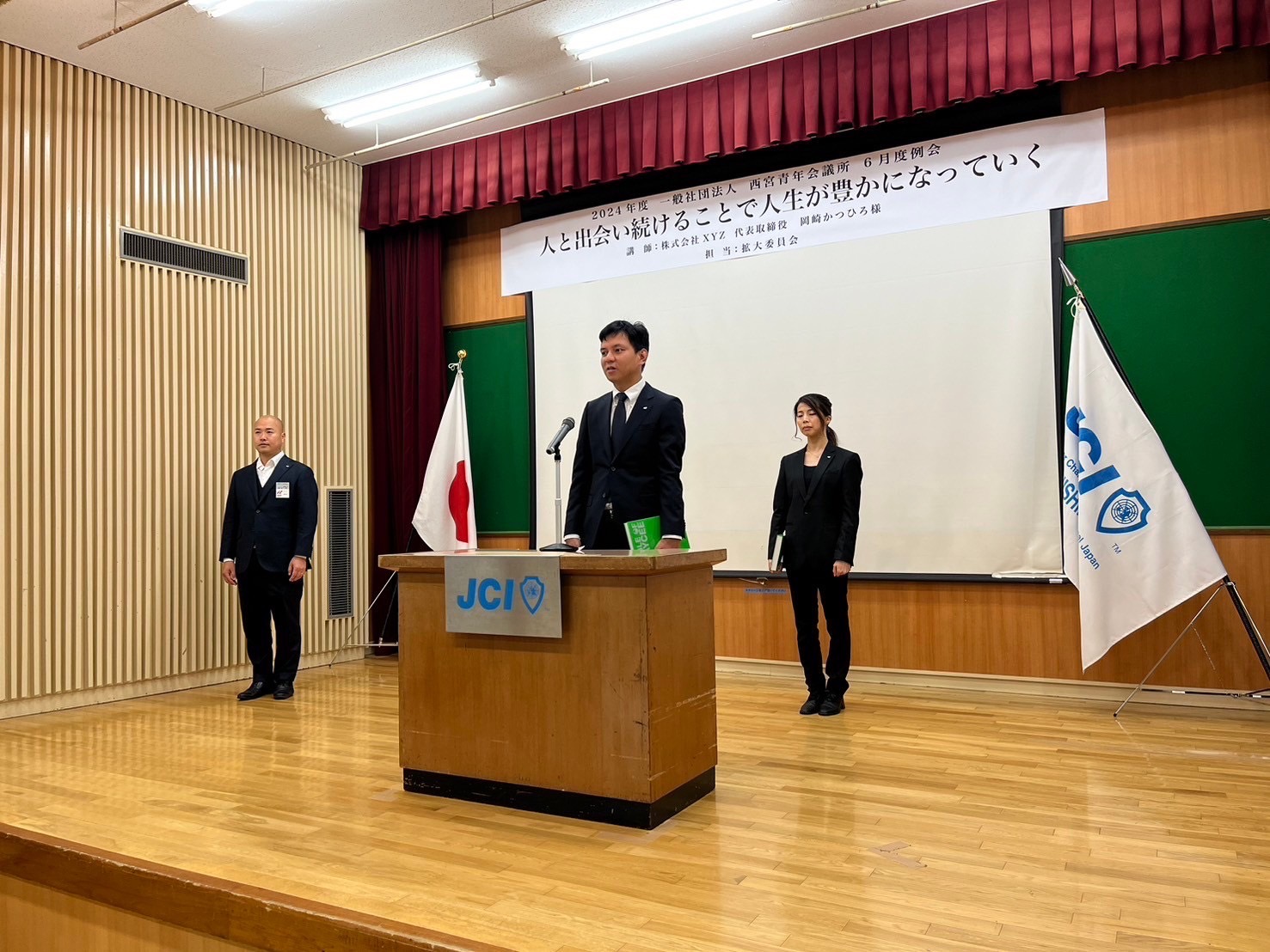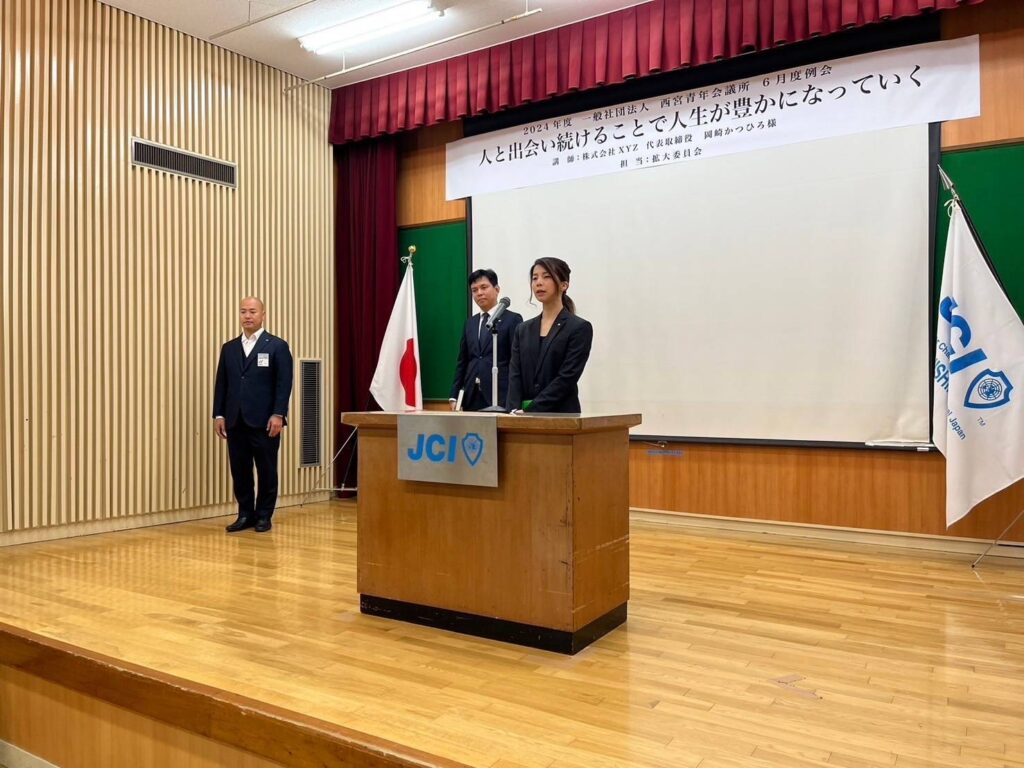 6月20日、当会議所では、6月度例会「人と出会い続けることで人生が豊かになっていく」と題し、人との出会いに感謝をしながら、青年会議所の更なる発展を目指し、開催されました。本例会では2名の新会員が入会しました。