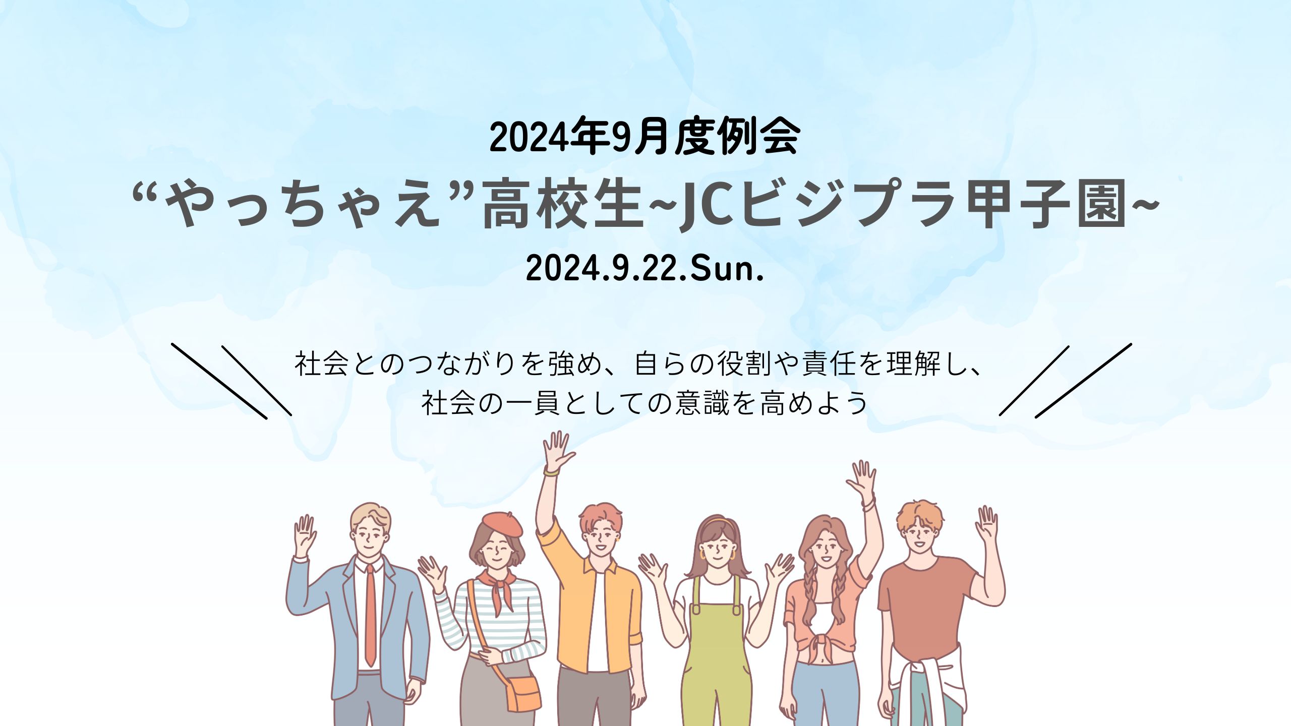 この度、9月度事業例会「“やっちゃえ”高校生∼JCビジプラ甲子園∼」を開催する運びとなりました。青少年は、学校の授業などから社会人になるための知識や能力を身に付け始めていますが、外部団体や社会全体との接点が不足していることから、社会人とのリアルなコミュニケーションが少ない状況にあります。そのため、外部団体との連携を通じて青少年が社会とのつながりを強め、自らの役割や責任を理解し、社会の一員としての意識を高めることが重要とされています。